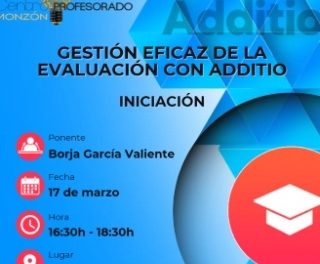 Gestión eficaz de la evaluación con Additio. Iniciación. Fecha: 17 de marzo de 16:30h a 18:30h. Lugar de celebración: Centro de Profesorado Monzón (online). Destinatarios: Docentes del ámbito del C.P. de Monzón. Periodo de inscripción: Del 3 de marzo al 15 de marzo. Más información e inscripciones en ENLACE