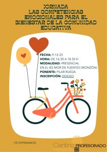 Jornada: Las competencias emocionales para el bienestar de la comunidad educativa Ponente: Pilar Rueda Fecha: 9-12-25 Hora: De 16:30 a 18:30 h. Destinatarios: Docentes de Infantil y Primaria. Lugar de celebración: IES Mor de Fuentes (Monzón) Periodo de inscripción: Del 11 de noviembre al 4 de diciembre. Más información e inscripciones en DOCEO
