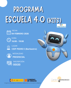 Programa Escuela 4.0 (kits) Fecha: 04 de febrero de 16:00 a 19:00 Lugar de celebración: CEIP PEDRO I (Barbastro) Modalidad: presencial Destinatarios: docentes de la etapa de educación infantil y primaria Periodo de inscripción: del 12 de enero al 02 de febrero Información e inscripciones en el siguiente ENLACE En esta actividad se realiza una …